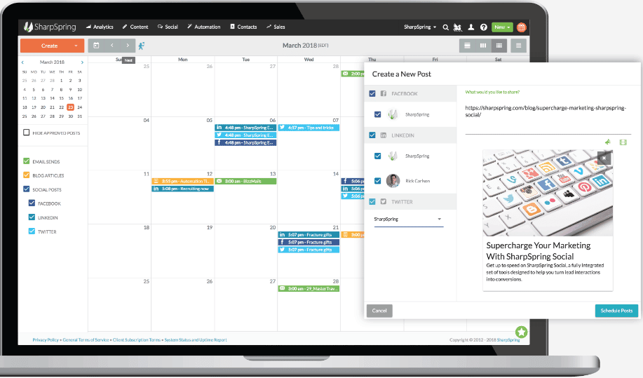 Sharpspring lets you schedule your posts on an easy to use content calendar. It features compatibility with all major social media platforms, emails, and blogs. Create your content and schedule it all in one fell swoop. This saves you time so you can focus on what matters; running your business.